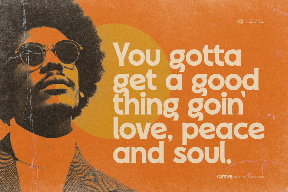 With its smooth curves and bold style, Castrell shines on movie titles, vintage logos, and retro posters artwork. Each letter feels alive, radiating Afro-soul charisma and an effortless party groove. This typeface is perfect for retro posters, 70s design vibes, vintage logos, movie titles, fashion branding, vintage exotic stuff, and nostalgic apparel.
