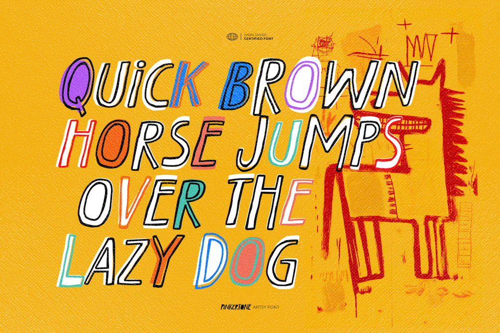 Unleash raw creativity with Pinkertone, an artsy hand-drawn font inspired by the rebellious energy of Jean-Michel Basquiat. Built with raw handdrawn strokes, this typeface carries an organic flow that feels rough, expressive, and youth-driven—perfect for designs that refuse to stay quiet.